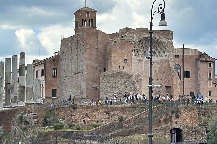Mientras paseas por la primera y segunda gradas del Coliseo, escucha historias sobre gladiadores luchando en la arena y descubre lugares de interés como la Curia (edificio del Senado) en el Foro Romano y los palacios imperiales en una de las famosas colinas de Roma, el Monte Palatino.